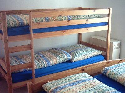 - die Schlafstube ist ausgestattet mit einem Ehebett und einem Doppelstockbett, Kleiderschrank, Nachttisch